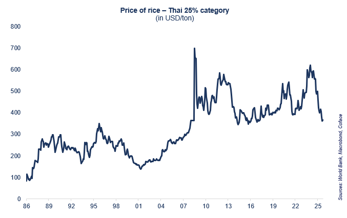 Desde 2022, India, el principal exportador mundial, había restringido sus ventas de exportación para contener el aumento de los precios mundiales (aumento del 19 % en 2022 y 2023) vinculado, en particular, a la guerra en Ucrania y a las malas condiciones meteorológicas en Asia. La reapertura de las exportaciones en 2024, junto con las cosechas récord en Asia, provocó una caída del 35 % en los precios en un año. Dadas las previsiones de aumento de la producción para 2026 y el posible regreso de La Niña en el cuarto trimestre de 2025, prevemos un creciente excedente de oferta en 2026. Se espera que los precios sigan cayendo al menos hasta finales de 2025, con una probable estabilización en 2026 a niveles no vistos en 10 años.