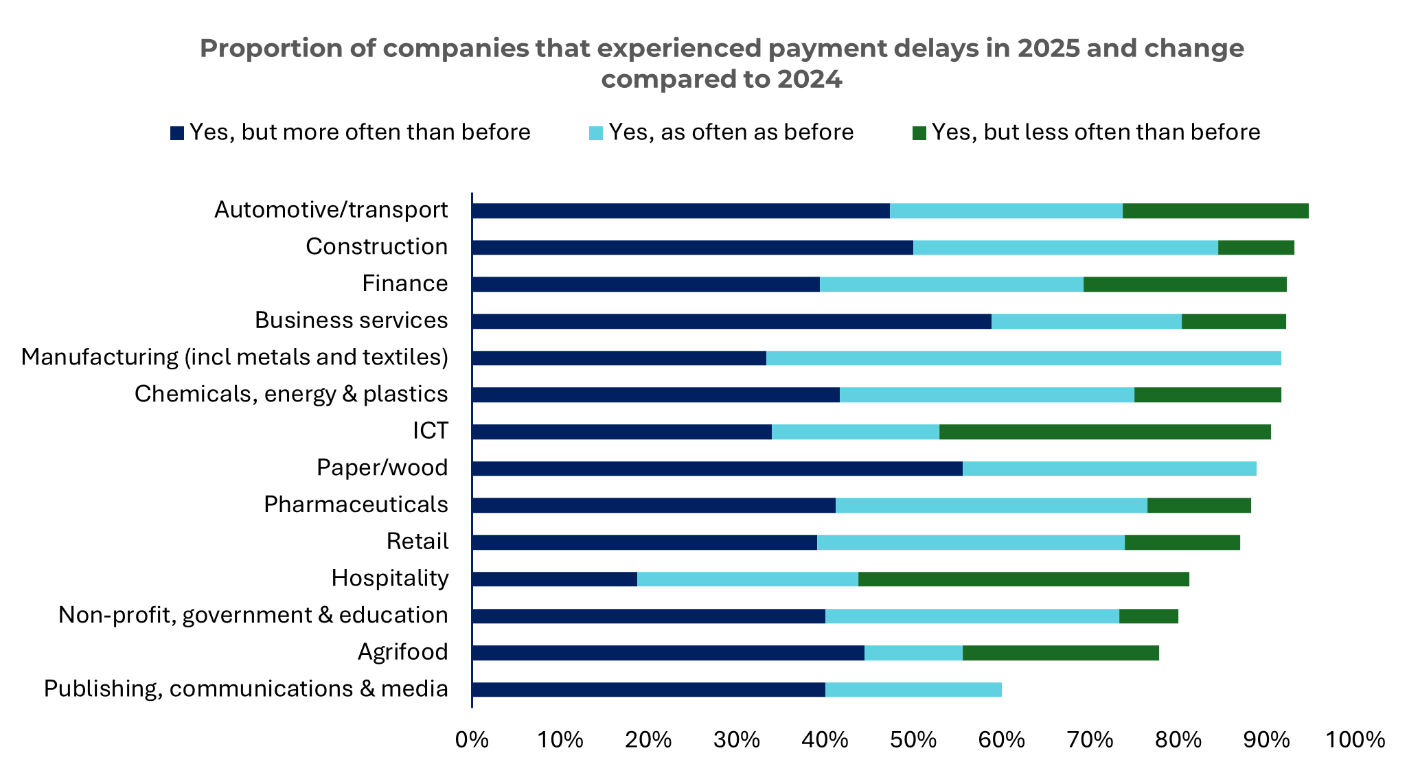 La construcción y el transporteson los más afectados por el aumento de los retrasos en los pagos (95 % y 93 %, respectivamente), mientras que los sectores editorial, de las comunicaciones y los medios de comunicación (60 %), agroalimentario (78 %) y sin fines de lucro, gubernamental y educativo (78 %) registran menos problemas. Esto se debe a menudo a plazos de pago más largos o a una mayor disciplina por parte de los compradores.